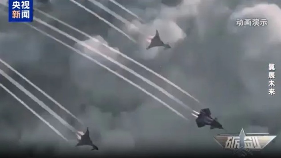 Caças não tripulados Xuan Nu que seriam disparados da nave de guerra chinesa Luanniao — Foto: ReproduçãoMas os céticos classificaram o projeto como uma manobra para "inspirar o povo chinês".